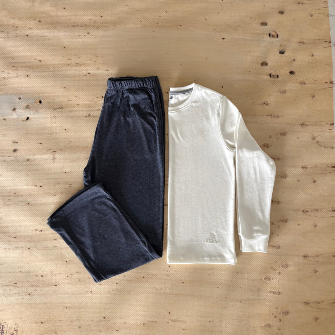 Pijama 100% algodon polo manga larga en ivory con pantalon recto con bolsillos laterales en azul.